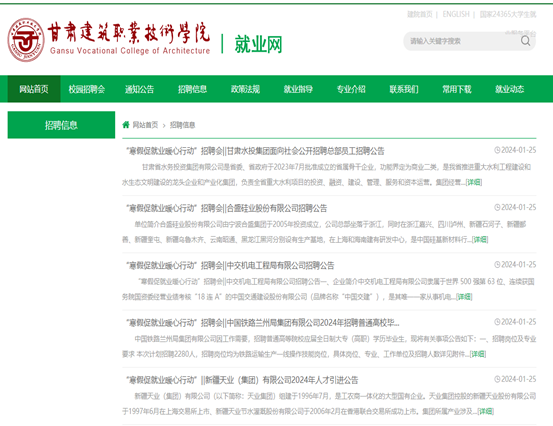 寒假期间,学院招生就业处和各系定期广泛搜集、筛选和与学院专业对口的招聘单位和岗位,积极引导毕业生按时参加线上招聘会活动,并为用人单位搭建招聘活动平台。截止目前,学院共召开线上招聘会五场,分别为新疆天业(集团)有限公司、中国铁路兰州局集团有限公司、中交机电工程局有限公司、合盛硅业股份有限公司、甘肃省水务投资集团有限公司,涉及安全类、水利类、工程类、土建类、装备类等多种岗位,招聘人数200人左右,同时,广泛宣传“兰州新区2024春季大型人才交流会”,组织各系就业指导人员动员2024届高校毕业生及往届离校未就业毕业生积极参与。进一步有效促进重点群体就业,以及为2024届毕业生提供了良好的就业实习机会。