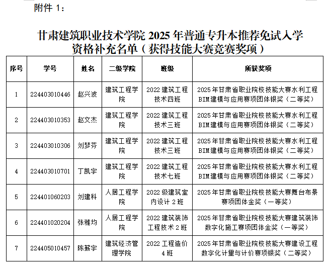 附件1:甘肃建筑职业技术学院2025年普通专升本推荐免试入学资格补充名单(获得技能大赛竞赛奖项)